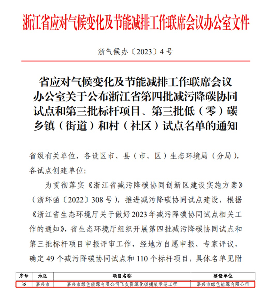 近日,浙江省应对气候变化及节能减排工作联席会议办公室公布了浙江省第四批减污降碳协同试点和第三批标杆项目、第三批低(零)碳乡镇(街道)和村(社区)试点名单,嘉兴市区生活垃圾焚烧项目飞灰资源化碳捕集示范工程成功入选全省第三批减污降碳标杆项目,为嘉兴市南湖区成功入选的两个项目之一。