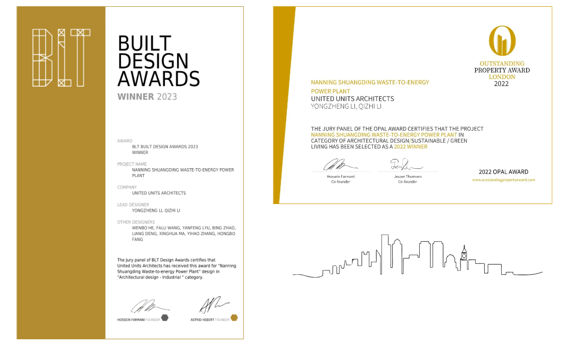 除三次荣获中国建设工程质量最高荣誉之一“鲁班奖”之外,康恒环境项目还先后荣获美国IDA国际设计奖、法国DNA设计大奖、英国OPAL伦敦杰出地产大奖、美国A+ Awards-、意大利A’Design Award等国际大奖,其中柳州项目更于2023年荣获BLT Built Design Awards建造设计奖工业建筑类优胜奖,成为全球首个获得该奖项的垃圾焚烧发电项目。